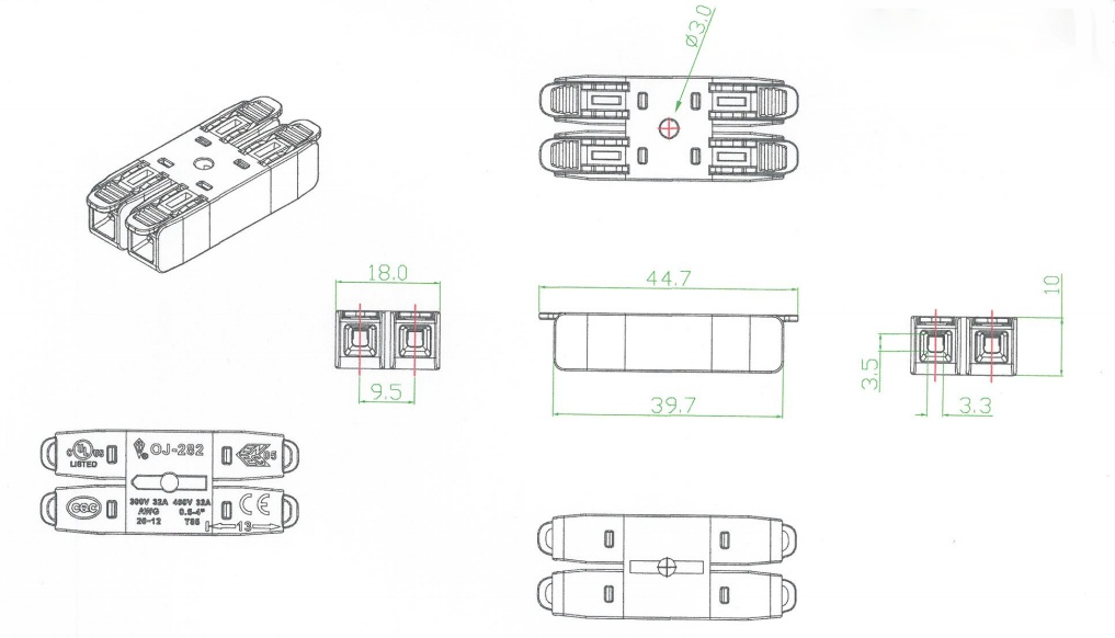 282二進二出快接端子尺寸圖: