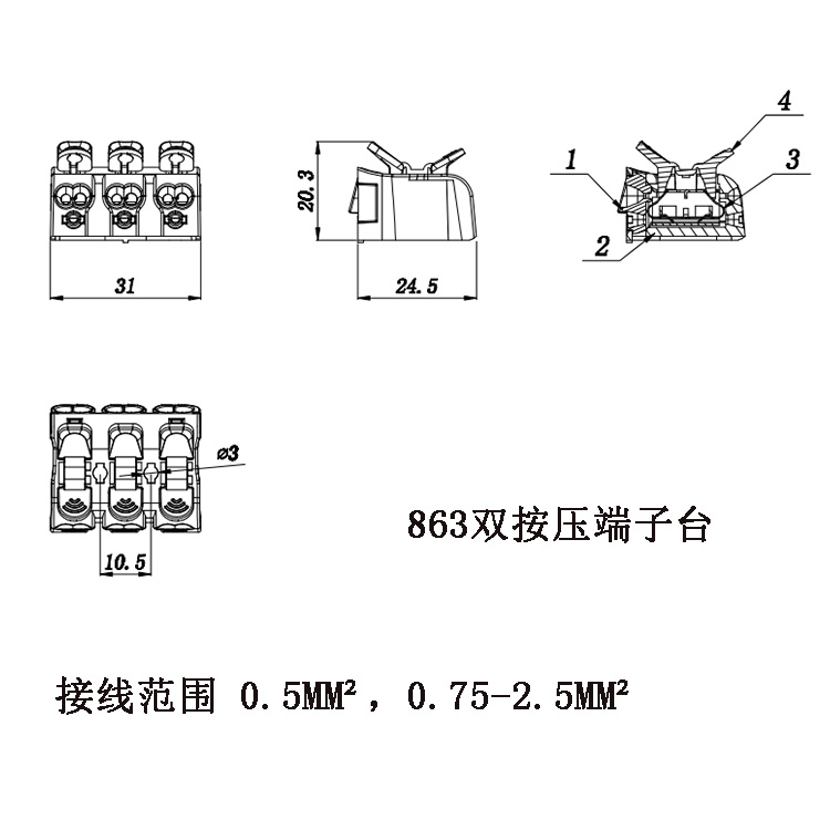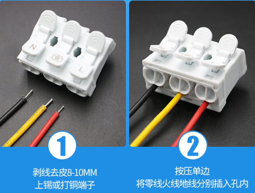 免螺絲按壓端子臺,有2至5位,用于連接燈具及其它設備。用途廣泛認證齊全,可連接0.75 至 2.5 mm2單股、多股以及細多股導線。可選配地極接線片,接線易操作,更快更方便