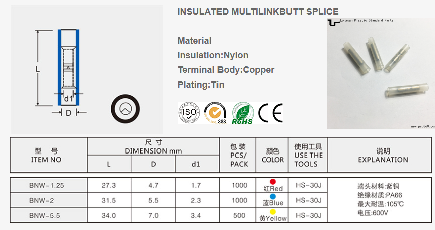 產品名稱:長形全絕緣中間接頭熱縮中接端子BNY1.25