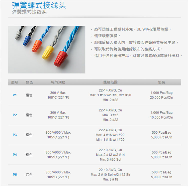 使用方法:電線剝線后插入接頭內,旋轉接頭,彈簧隨著夾緊電線。