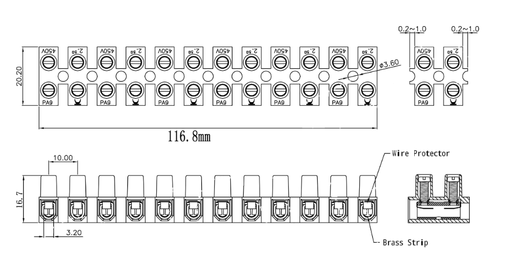 PA9HDS-12P帶彈片接線端子臺(tái)尺寸圖: