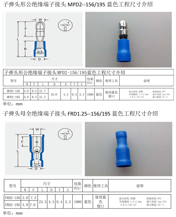 產品名稱:子彈頭公母全絕緣端子FRD2/MPD--156/195藍色