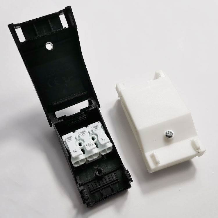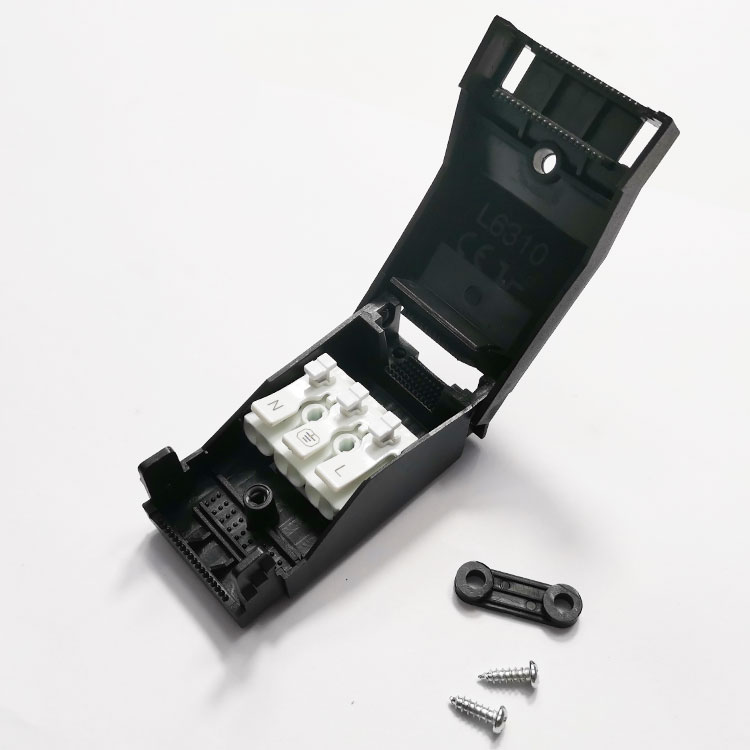6310三位快接盒主要是由4件套組成,上蓋+下蓋+接線端子+紅螺絲,特殊情況還可以加一個壓線板。6310快接盒可以配923-3/P02-3三位按壓式端子臺,也可以配歐規貫通式接線端子臺PA9 PA10,接0.5-2.5平方線。當燈飾廠是鎖0.5平方線的時候,那么我們可以另外再加一個壓線板固定防拉!鎖0.5以上到2.5平方線的時候,只需要一顆紅色塑膠螺絲鎖緊即可,工藝簡化,更加方便快捷!