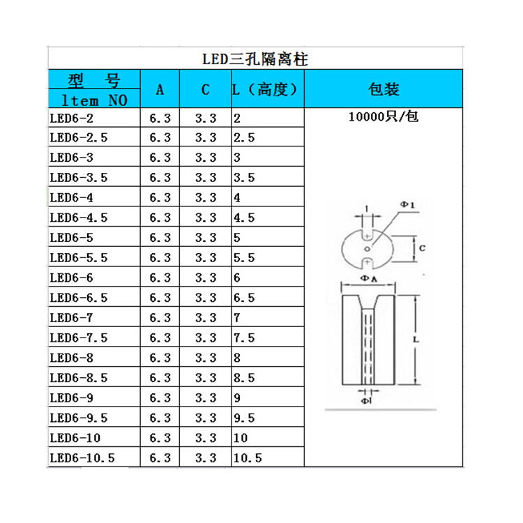 產品名稱:雙色LED隔離柱3P 6*10mm白色LED燈隔離柱導光柱 尼龍三孔塑料間隔柱