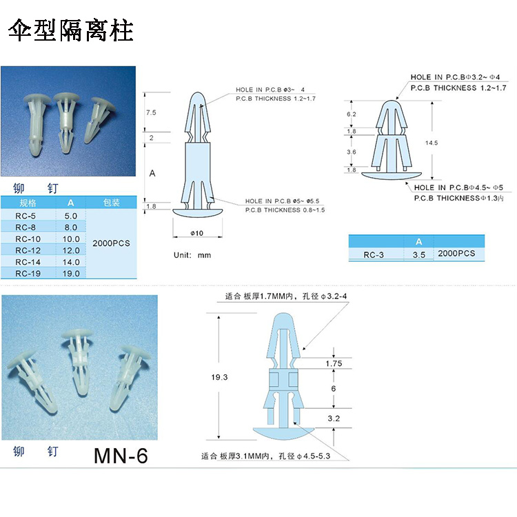 產品名稱:RC系列傘型隔離柱尼龍鉚釘PC板主電路板卡扣支撐柱RC-5隔離柱