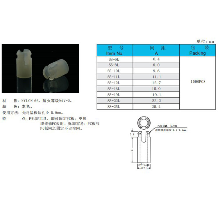 產品名稱:PC板間隔柱SS系列 ,尼龍間隔柱,塑膠絕緣柱,