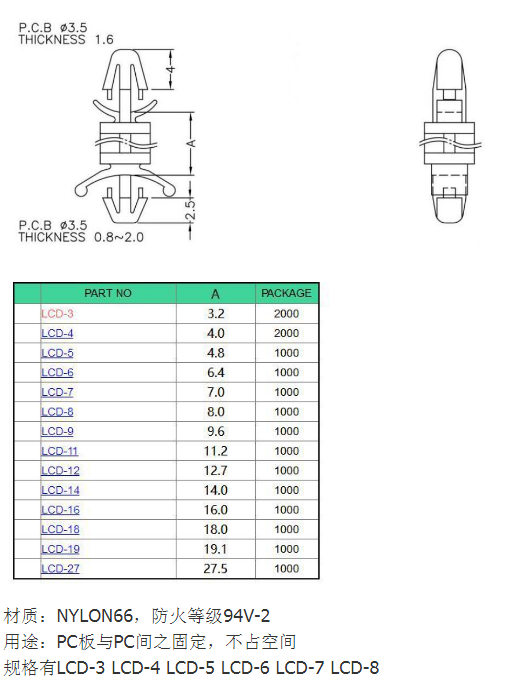 用途:一端固定于機(jī)板上,另一端支撐PC板,避免下陷造成短路,PC板免鉆孔