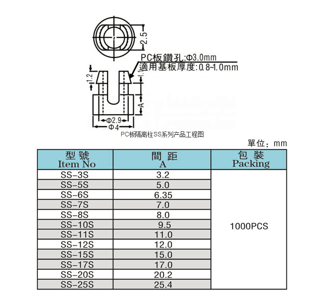 PC板隔離柱尺寸圖: