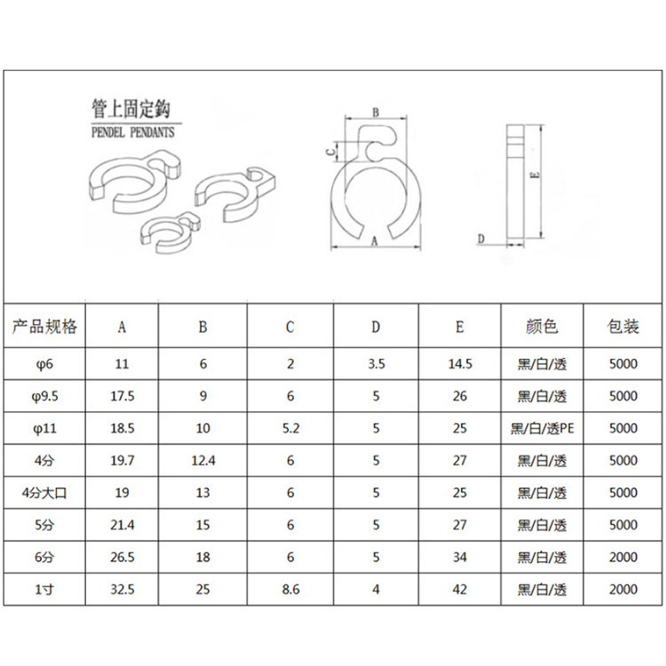產品規格:管上鉤尺寸表: