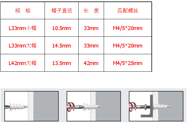 產品用途:與螺絲配套使用,可直接使用工具旋進旋出,安置于石膏板材中,再將物件用螺絲固定。螺旋型結構,使墻面不易受損。通常適用電器,燈飾,燈具,輕質鏡柜等掛墻物