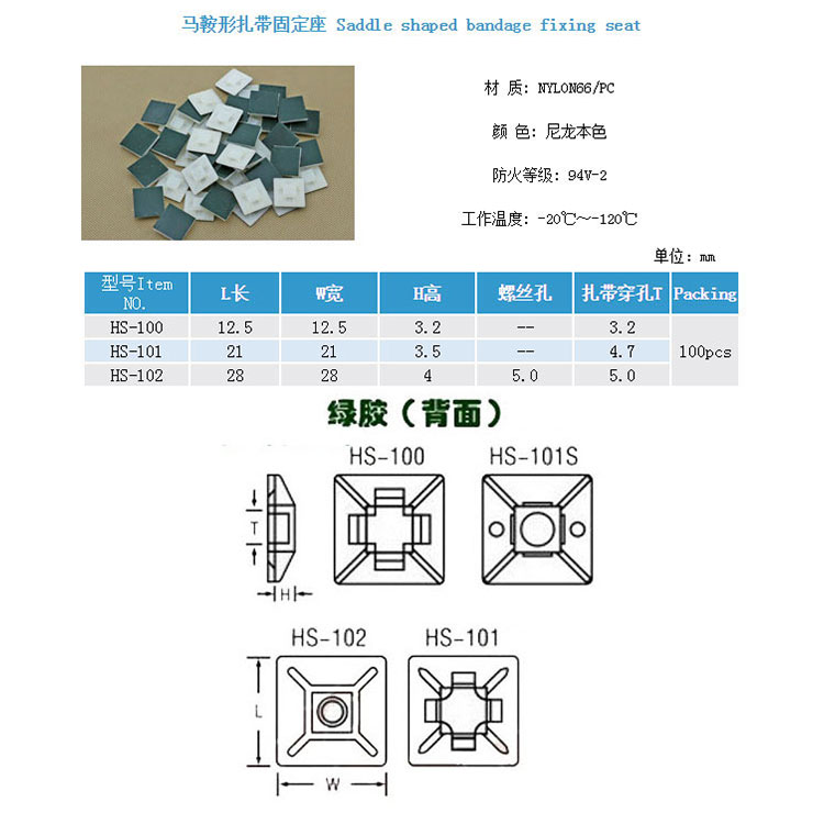產品名稱:扎帶固定座自粘式配線固定器HS-100(12.5*12.5mm)布線電線卡扣