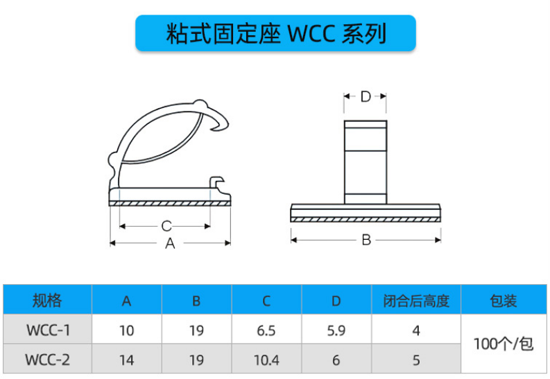 產品特點:裝配簡單、快速、牢固,開啟容易,可多次重復使用。一種規格的 WCC型粘式固定座,即可適合多種規格的電線使用