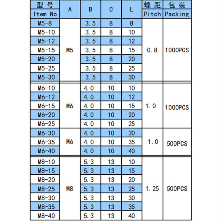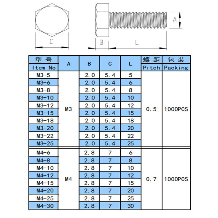 產品規格:尼龍外六角頭螺絲尺寸表:
