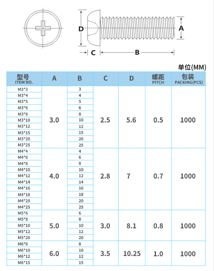 產(chǎn)品介紹:名稱:圓頭十字螺絲M6*10 塑膠螺絲釘 PC板螺絲