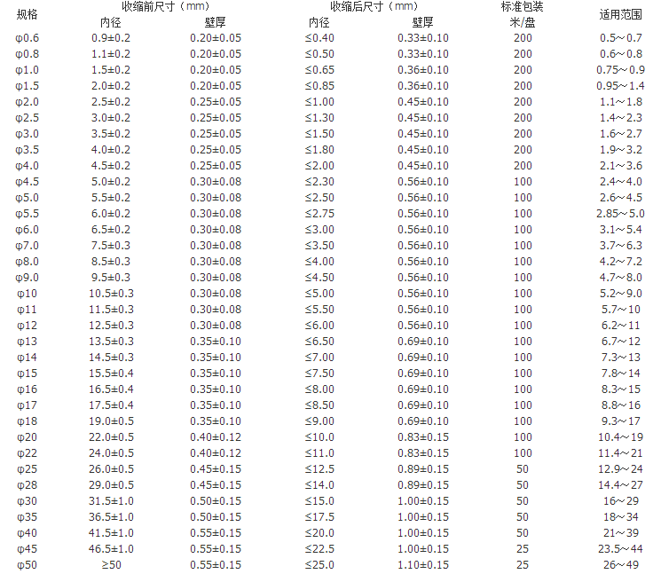 熱縮倍率: 2:1,縱向收縮率≤8%;