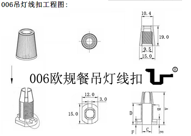 用法:006線扣是用于鎖緊,固定,保護線材的,主要用于吊燈的吸頂盒/盤處固定線材,有一點要注意的是鎖緊線后到吸頂盒內部的端子的連接處這段線材要保持一定的彎曲度,這樣才能保證端子處不受到拉力而松脫斷路!對于吊燈而言,太過重的燈體還要用鋼絲加于承重!線扣的拉力要保持在32KG以上!UL的線扣測試標準是吊35磅<約35KG>1分鐘位移不能超過2mm!