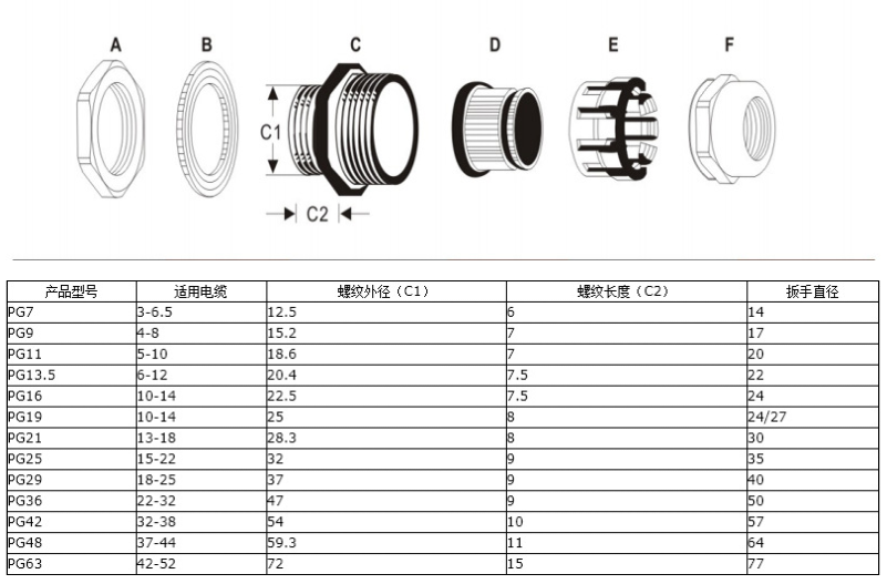 特殊夾緊爪與夾緊圈凹凸相扣設計,配合迫緊頭裝配省時便利,夾緊電纜范圍大、抗拉力強、可防水、防塵、抗鹽、耐酸堿、酒精、油脂及一般溶劑。