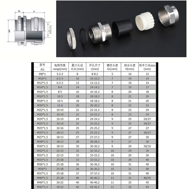 特殊夾緊爪與夾緊圈凹凸相扣設計,配合迫緊頭裝配省時便利,夾緊電纜范圍大、抗拉力強、可防水、防塵、抗鹽、耐酸堿、酒精、油脂及一般溶劑。