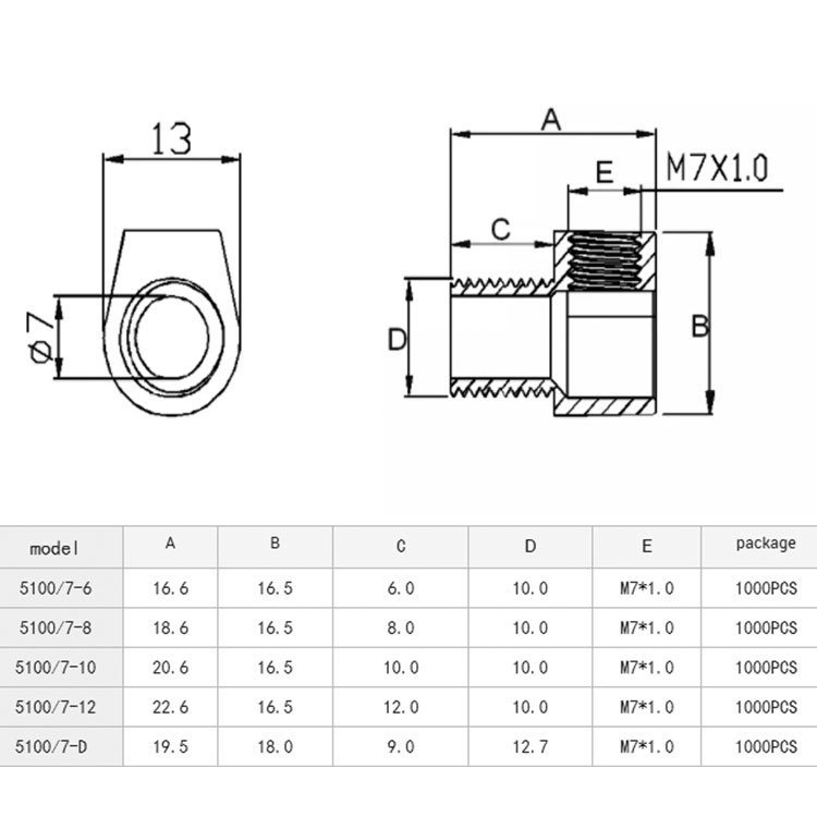 外螺紋:M10*1.0(可配套M10六角螺母)
