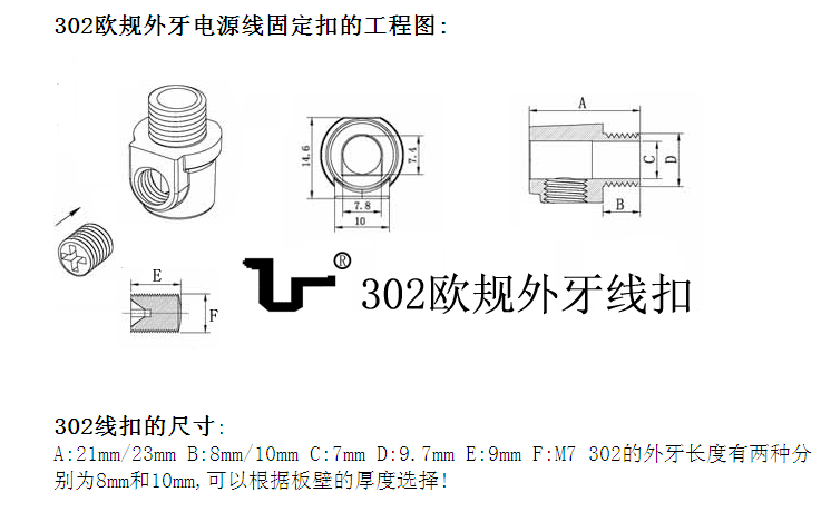 使用:將302線扣用3分螺母固定在板壁上把電源線穿過302線扣的中孔然后調整好電源線的位置鎖好即可.